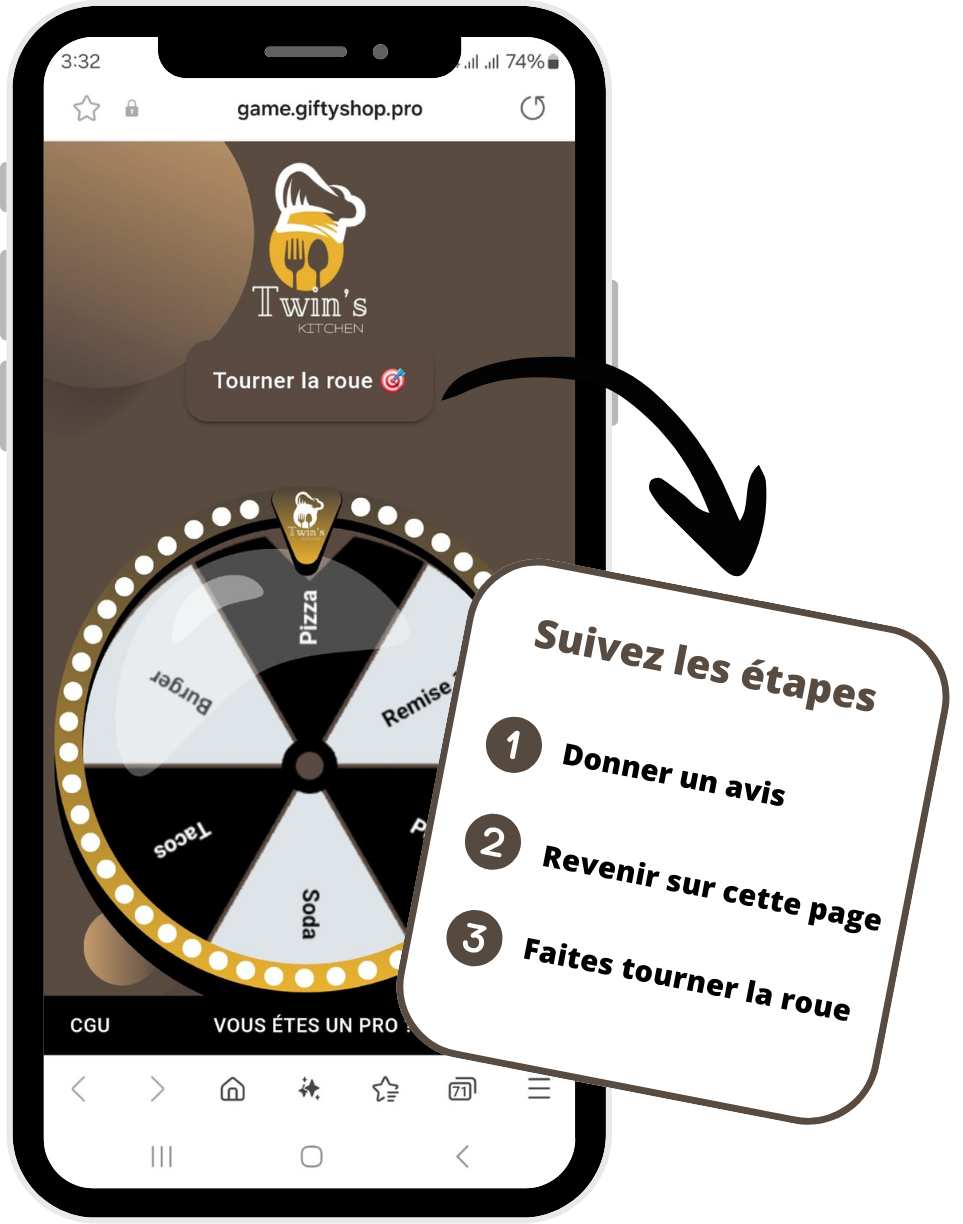 C’est très simple : vos clients scannent un QR code disponible dans votre établissement ou sur vos supports de communication, et ils peuvent tourner la roue pour tenter de gagner les cadeaux ou avantages que vous proposez.